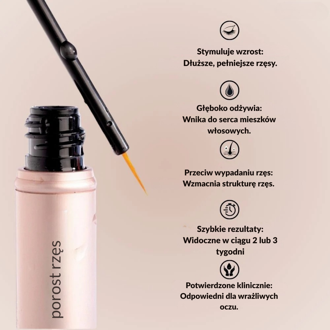 Stymuluje naturalny wzrost rzęs, zapewniając pełniejszy wygląd.